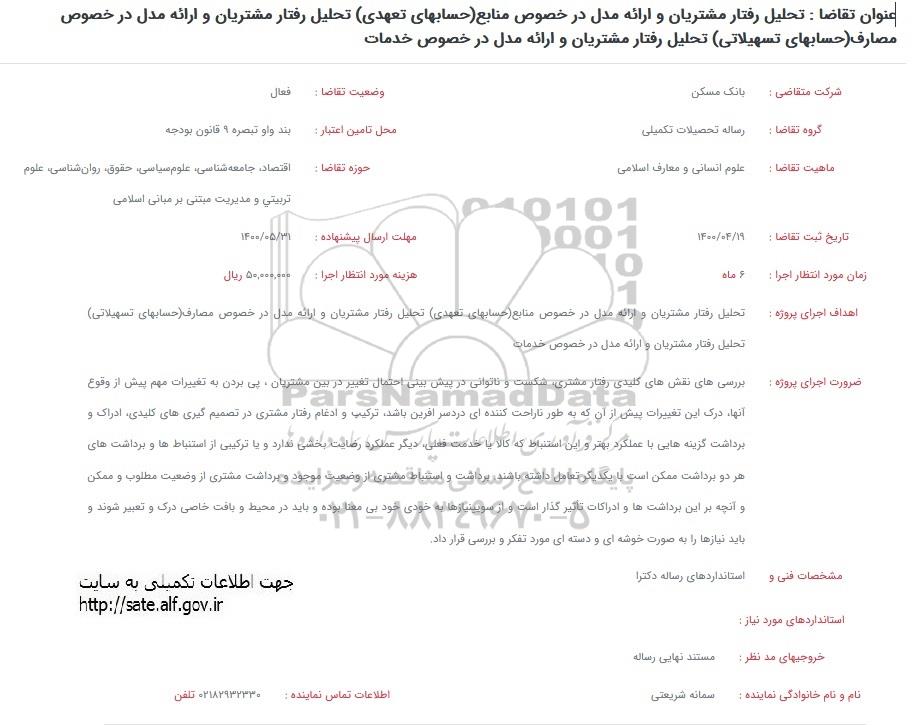 فراخوان تحلیل رفتار مشتریان و ارائه مدل در خصوص منابع از کلیه افراد متخصص و شرکتها واجد شرایط دعوت به عمل میآید در مناقصه با کد خبرگزاری پارس نماد: 3591880 شرکت نمایند.