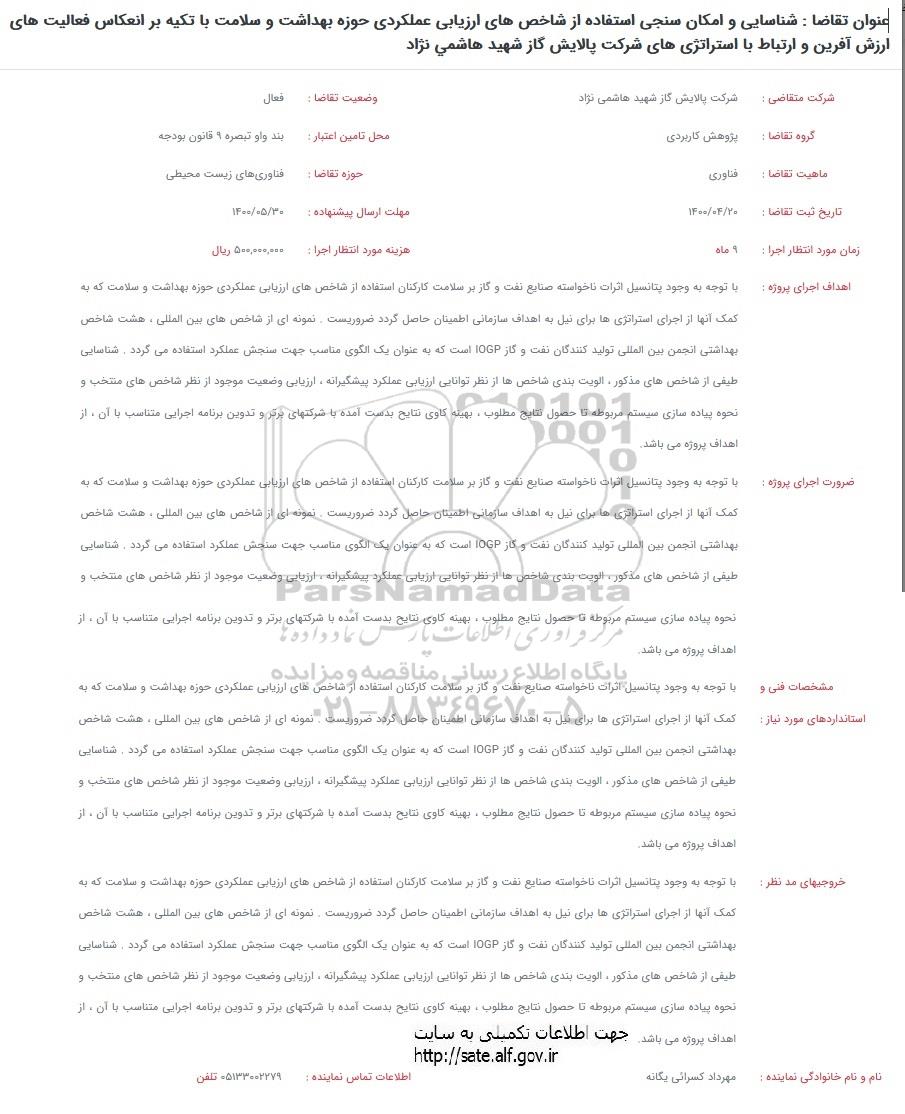 عنوان تقاضا : شناسایی و امکان سنجی استفاده از شاخص های ارزیابی عملکردی حوزه بهداشت و سلامت با تکیه بر انعکاس فعالیتهای ارزش آفرین و ارتباط با استراتژی های شرکت پالایش گاز شهید هاشمی نژاد