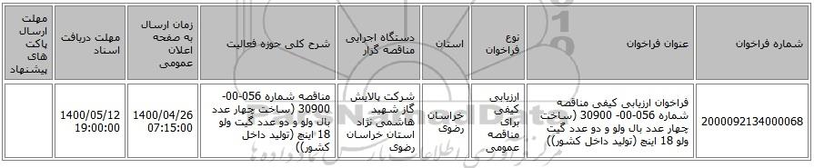 مناقصه، فراخوان ارزیابی کیفی مناقصه شماره 056-00- 30900 (ساخت چهار عدد بال ولو و دو عدد گیت ولو 18 اینچ (تولید داخل کشور)), فراخوان ارزیابی کیفی مناقصه شماره 056-00- 30900 (ساخت چهار عدد بال ولو و دو عدد گیت ولو 18 اینچ (تولید داخل کشور))