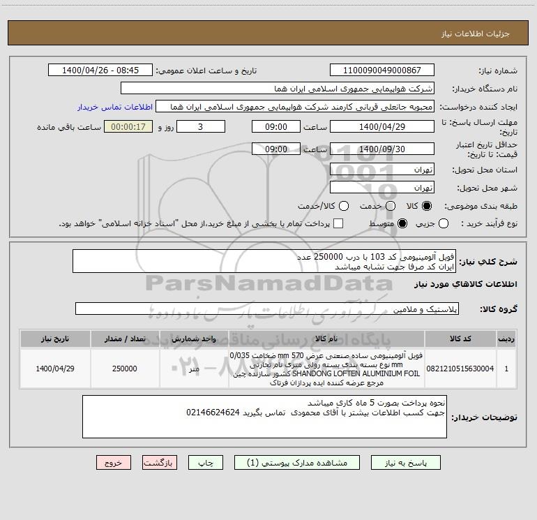 شرح کلی نیاز: فویل آلومینیومی کد 103 با درب 250000 عدد