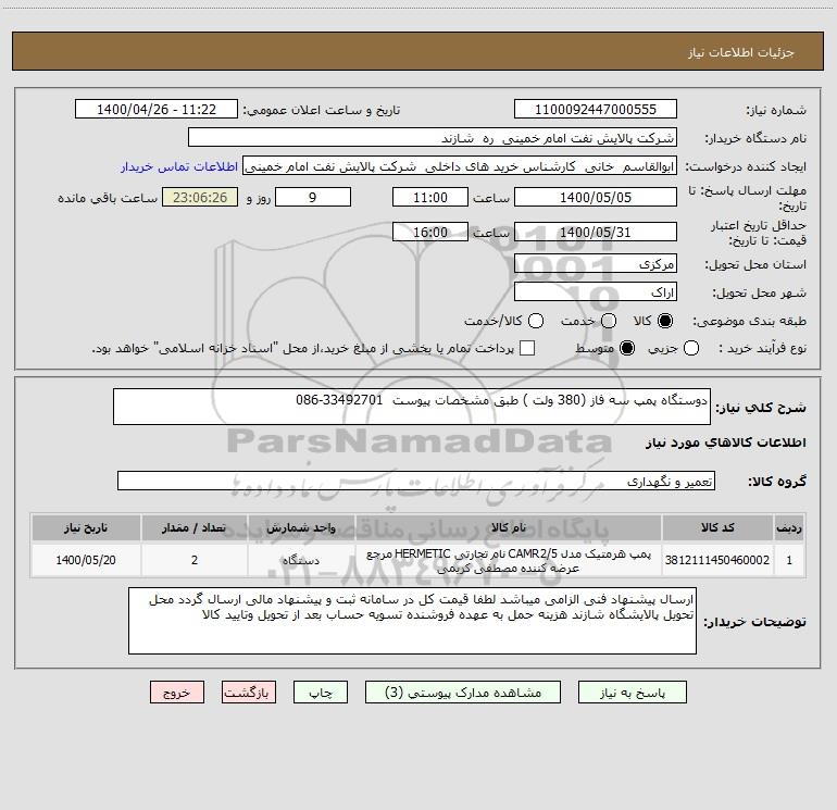 شرح کلی نیاز: دوستگاه پمپ سه فاز (380 ولت ) طبق مشخصات پیوست 33492701-086