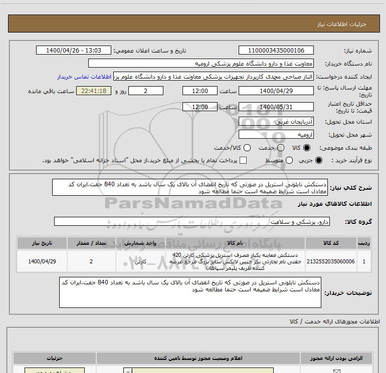 توضیحات خریدار:دستکش نایلونی استریل در صورتی که تاریخ انقضای آن بالای یک سال باشد به تعداد 840 جفت،ایران کد معادل است شرایط ضمیمه است حتما مطالعه شود