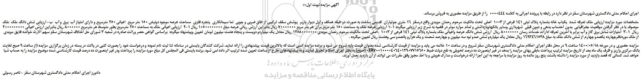اجرای احکام مدنی دادگستری شهرستان سقز در نظر دارد در رابطه با پرونده اجرائی به کلاسه 0000444 را از طریق مزایده حضوری به فروش برساند.