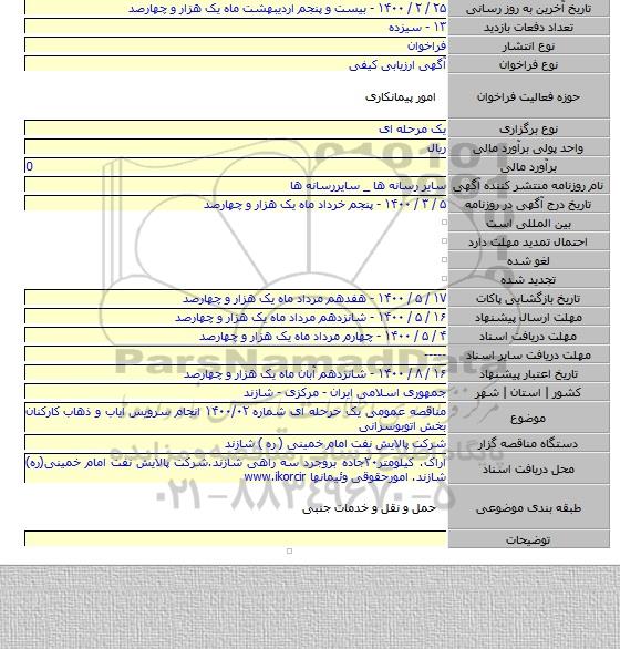 این مناقصه در تاریخ 1400/04/27 شروع و مهلت آن تا تاریخ 1400/05/04 میباشد.