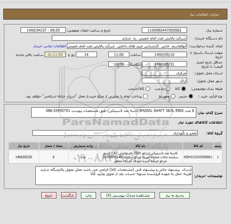 علاقهمندان میتوانند جهت دریافت اسناد و اطلاعات تکمیلی، استعلام 6 عدد RADIAL SHAFT SEAL RING(کاسه نمد لاستیکی) طبق مشخصات پیوست 33492701-086 با سامانه مناقصات و مزایدات ایران پارسنماد داده ها 88349670 تماس حاصل نمایند.