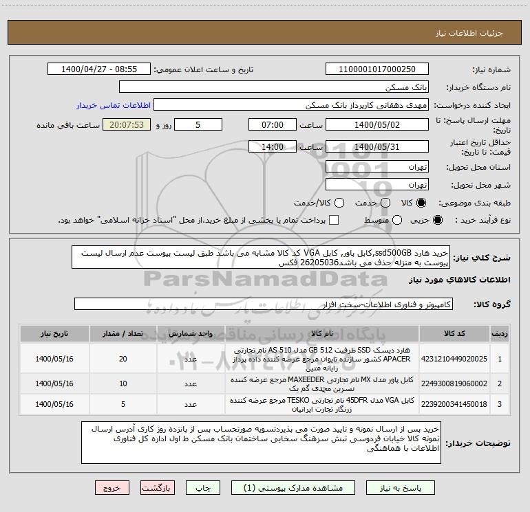 شرح کلی نیاز: خرید هارد ssd500GB,کابل پاور, کابل VGA کد کالا مشابه می باشد طبق لیست پیوست عدم ارسال لیست پیوست به منزله حذف می باشد26205036 فکس