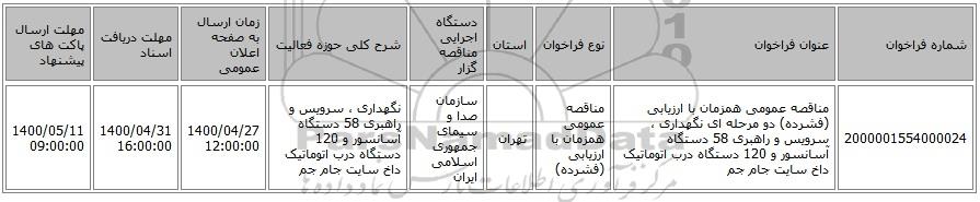 2000001554000024مناقصه عمومی همزمان با ارزیابی (فشرده) دو مرحله ای نگهداری ، سرویس و راهبری 58 دستگاه آسانسور و 120 دستگاه درب اتوماتیک داخ سایت جام جممناقصه عمومی همزمان با ارزیابی (فشرده)تهرانسازمان صدا و سیمای جمهوری اسلامی ایراننگهداری ، سرویس و راهبری 58 دستگاه آسانسور و 120 دستگاه درب اتوماتیک داخ سایت جام جم1400/04/27 12:00:001400/04/31 16:00:001400/05/11 09:00:00