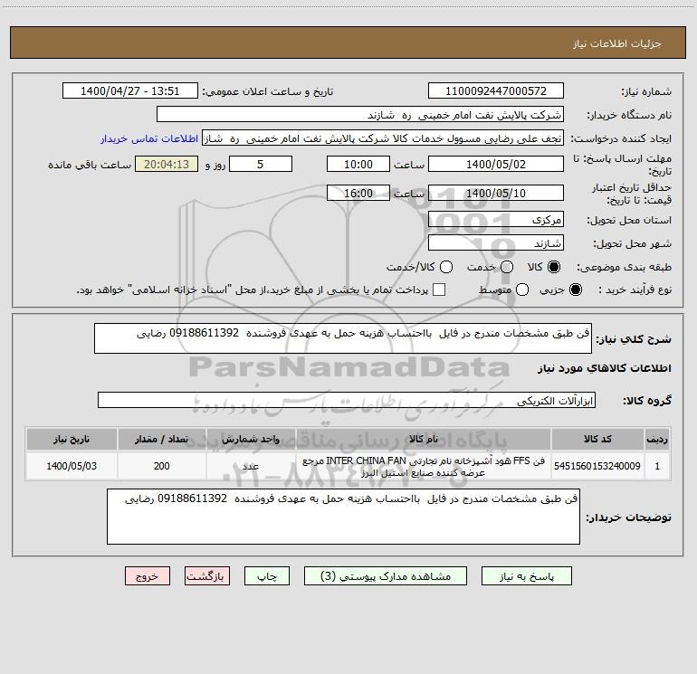 شرح کلی نیاز: فن طبق مشخصات مندرج در فایل بااحتساب هزینه حمل به عهدی فروشنده 09188611392 رضایی