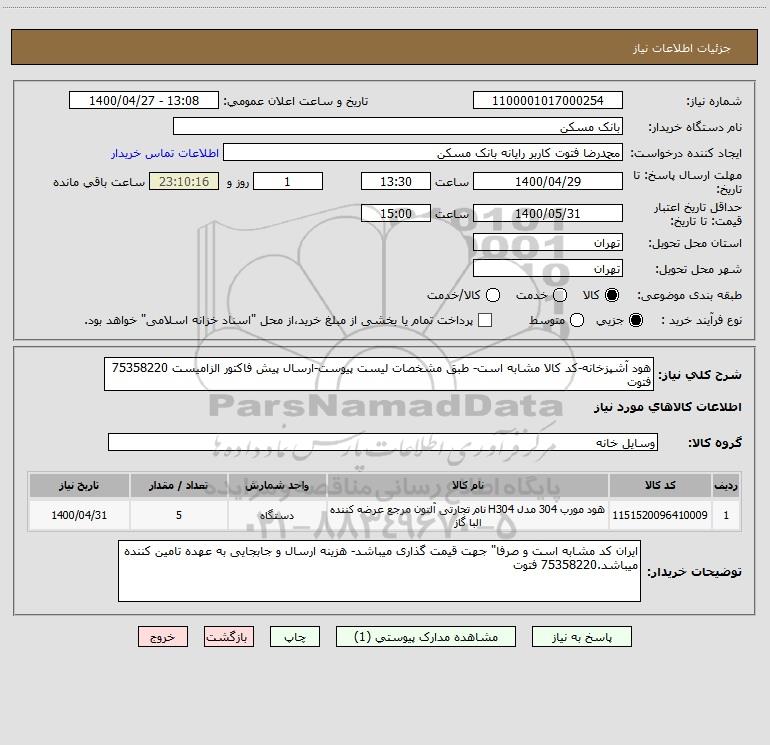 شرح کلی نیاز: هود آشپزخانه-کد کالا مشابه است- طبق مشخصات لیست پیوست-ارسال پیش فاکتور الزامیست 75358220 فتوت