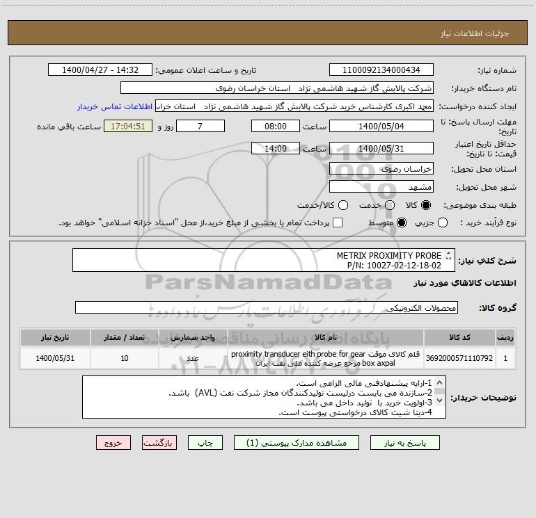 نام دستگاه خریدار:شرکت پالایش گاز شهید هاشمی نژاد استان خراسان رضوی