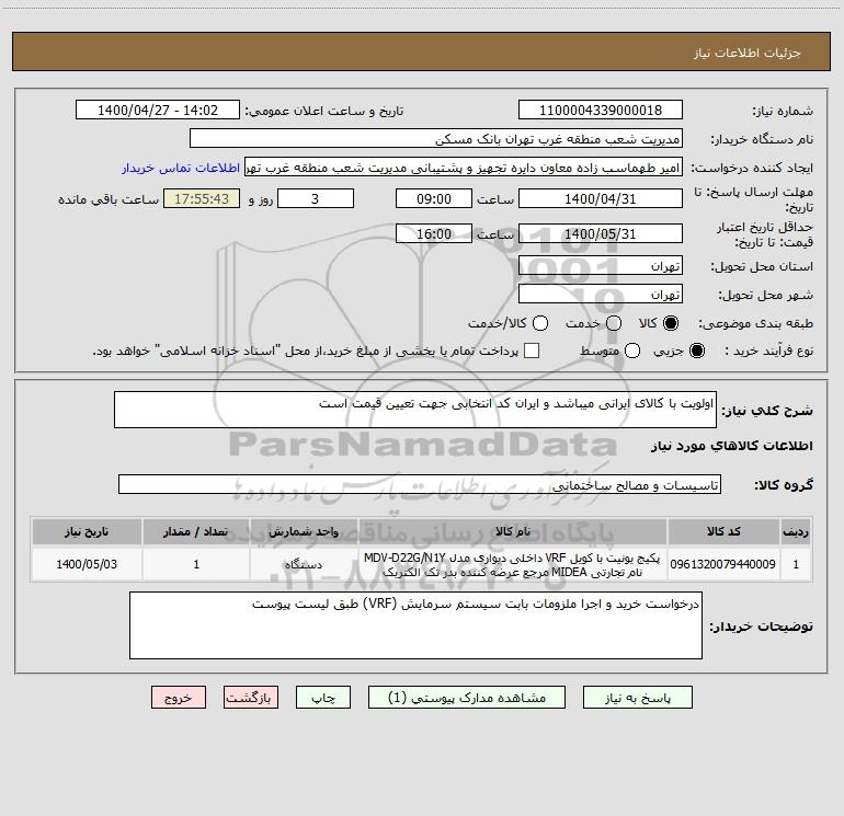 نام دستگاه خریدار:مدیریت شعب منطقه غرب تهران بانک مسکن