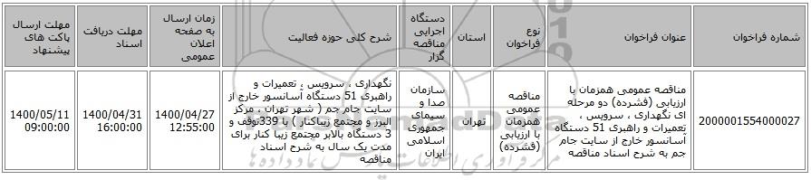 مناقصه، مناقصه عمومی همزمان با ارزیابی (فشرده) دو مرحله ای نگهداری ، سرویس ، تعمیرات و راهبری 51 دستگاه آسانسور خارج از سایت جام جم به شرح اسناد مناقصه , مناقصه عمومی همزمان با ارزیابی (فشرده) دو مرحله ای نگهداری ، سرویس ، تعمیرات و راهبری 51 دستگاه آسانسور خارج از سایت جام جم به شرح اسناد مناقصه