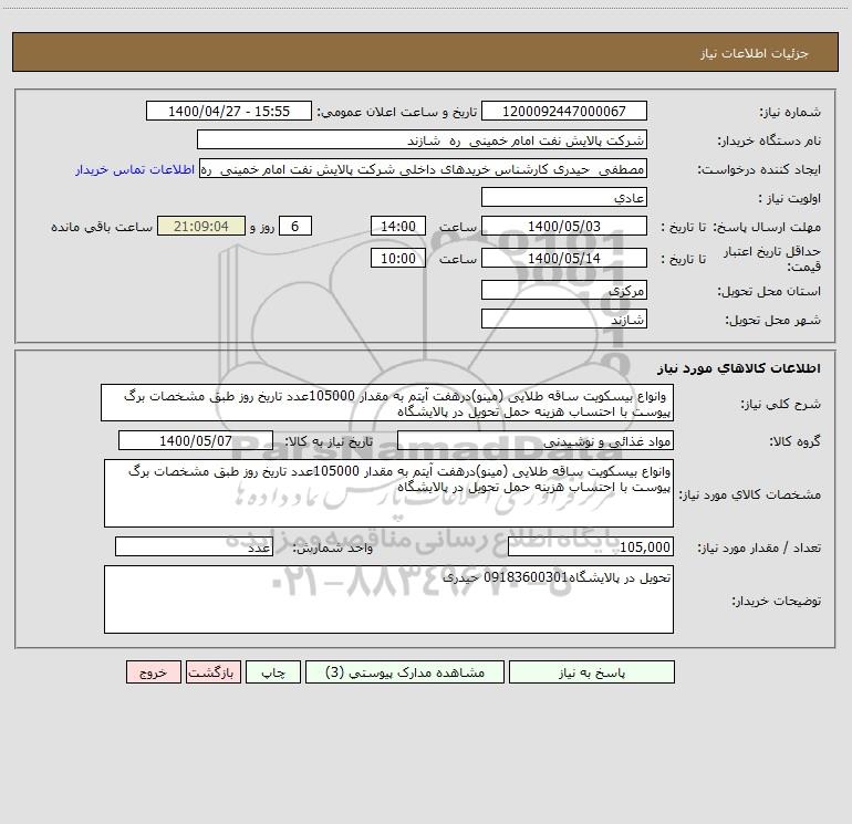شرح کلی نیاز: وانواع بیسکویت ساقه طلایی (مینو)درهفت آیتم به مقدار 105000عدد تاریخ روز طبق مشخصات برگ پیوست با احتساب هزینه حمل تحویل در پالایشگاه