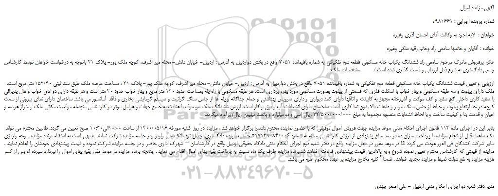 ارزیابی و تعیین قیمت ششدانگ یکباب خانه مسکونی قطعه دوم تفکیکی به شماره باقیمانده 7051 واقع در بخش دواردبیل به آدرس : اردبیل- خیابان دانش- محله میر اشرف، کوچه ملک پور- پلاک 21 ، مساحت عرصه ملک طبق سند ثبتی 152/40 متر مربع است. ملک دارای پیلوت و سه طبقه مسکونی و بهار خواب با اسکلت فلزی که قسمتی از پیلوت بصورت مسکونی مورد بهره برداری است. هر طبقه مسکونی با راه پله بمساحت حدود 120 متر مربع و بهار خواب حدود 20 متر است و هر طبقه دارای دو اتاق خواب و هال پذیرائی با سفید کاری داخلی گچ سفید و کف موکت و آشپزخانه مجهز به کابینت و اتاقها دارای کمد دیواری و دارای سرویس بهداشتی و حمام جداگانه و پله ها از جنس سنگ گرانیت و سیستم گرمایشی بخاری و فاقد آسانسور می باشد. ساختمان دارای نمای بیرونی از سمت کوچه در حد ارتفاع پیلوت و حیاط از جنس سنگ مرمر و طبقات بالا بدون نما کاری است. ساختمان دارای انشعابات آب و برق و گاز است. ارزش ششدانگ ملک موصوف با عنایت به جمیع جهات و عوامل موثر در کارشناسی منجمله موقعیت مکانی ملک و متراژ عرصه و اعیان و قدمت بنا و کیفیت ساخت و با لحاظ انشعابات منصوبه مجموعا به مبلغ 32/500/000/000 ریال (سی و دو میلیارد و پانصد میلیون ریال) برآورد میگردد.