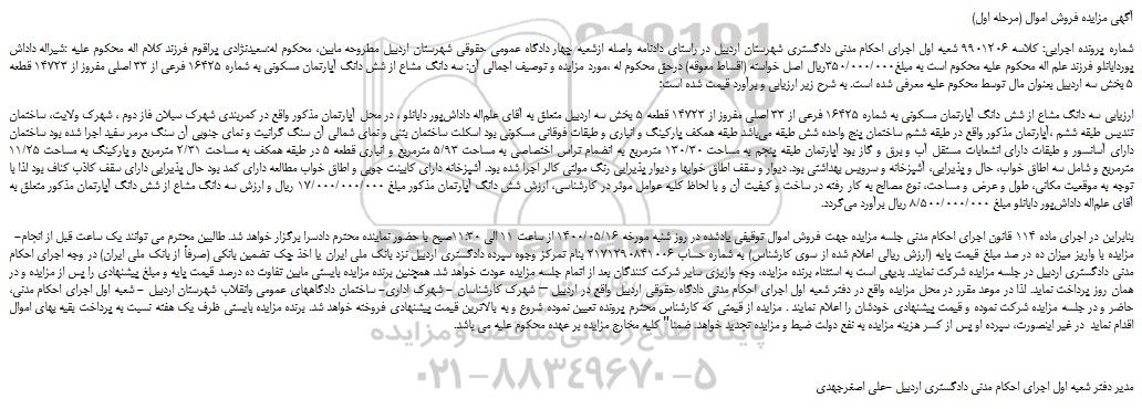 شماره پرونده اجرایی: کلاسه 9901206 شعبه اول اجرای احکام مدنی دادگستری شهرستان اردبیل در راستای دادنامه واصله ازشعبه چهار دادگاه عمومی حقوقی شهرستان اردبیل مطروحه مابین، محکوم له:سعیدنژادی پراقوم فرزند کلام اله محکوم علیه :شیراله داداش پوردابانلو فرزند علم اله محکوم علیه محکوم است به مبلغ350/000/000ریال اصل خواسته (اقساط معوقه) درحق محکوم له ،مورد مزایده و توصیف اجمالی آن: سه دانگ مشاع از شش دانگ آپارتمان مسکونی به شماره 16425 فرعی از 33 اصلی مفروز از 14723 قطعه 5 بخش سه اردبیل بعنوان مال توسط محکوم علیه معرفی شده است. به شرح زیر ارزیابی و برآورد قیمت شده است؛
