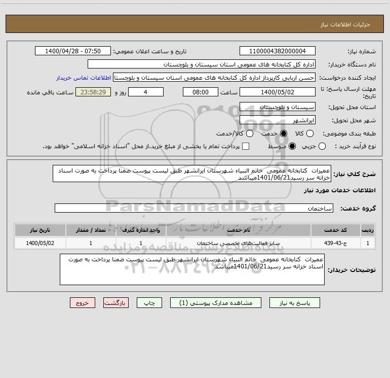 شرح کلی نیاز: عمیرات کتابخانه عمومی خاتم النبیاء شهرستان ایرانشهر طبق لیست پیوست ضمنا پرداخت به صورت اسناد خزانه سر رسید1401/06/21میباشد