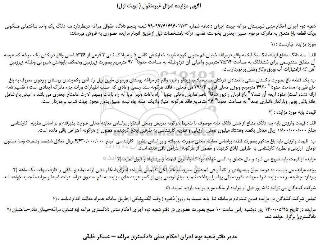 شعبه دوم اجرای احکام مدنی شهرستان مراغه جهت اجرای دادنامه شماره 9909974149401233 شعبه پنجم دادگاه حقوقی مراغه درنظردارد سه دانگ یک واحد ساختمانی مسکونی ویک قطعه باغ متعلق به ماترک مرحوم حسین جعفری بخواسته تقسیم ترکه بامشخصات ذیل ازطریق انجام مزایده حضوری به فروش میرساند: