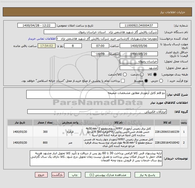 شرح کلی نیاز: دو قلم کابل آرموردار مطابق مشخصات ضمیمه