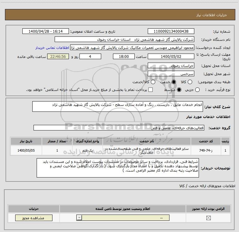 شرح کلی نیاز: انجام خدمات عایق ، داربست ، رنگ و آماده سازی سطح - شرکت پالایش گاز شهید هاشمی نژاد