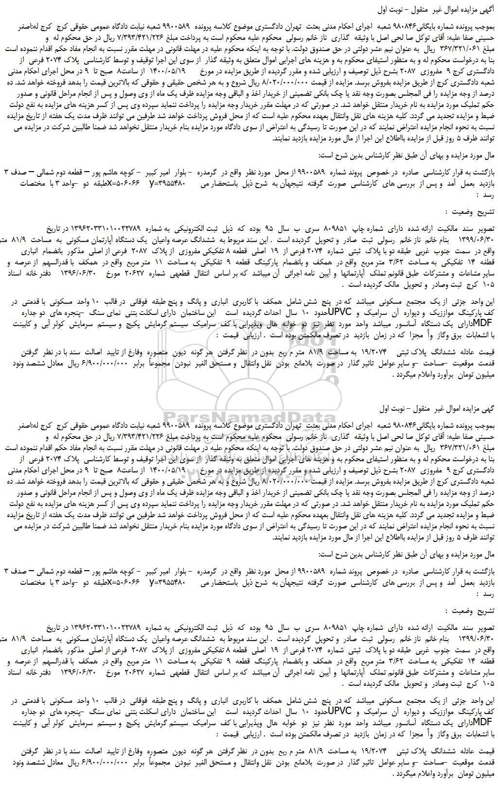 بموجب پرونده شماره بایگانی980846 شعبه اجرای احکام مدنی بعثت تهران دادگستری موضوع کلاسه پرونده 9900589 شعبه نیابت دادگاه عمومی حقوقی کرج کرج له:اصغر حسینی صفا علیه: آقای توکل صا لحی اصل با وثیقه گذاری ناز خانم رسولی محکوم علیه محکوم است به پرداخت مبلغ 7/393/421/226 ریال در حق محکوم له و مبلغ 367/321/061 ریال به عنوان نیم عشر دولتی در حق صندوق دولت. با توجه به اینکه محکوم علیه در مهلت قانونی در مهلت مقرر نسبت به انجام مفاد حکم اقدام ننموده است بنا به درخواست محکوم له و به منظور استیفای محکوم به و هزینه های اجرایی اموال متعلق به وثیقه گذار از سوی این اجرا توقیف و توسط کارشناسی پلاک 2074 فرعی از دادگستری کرج 9 مفروزی 2087 بشرح ذیل توصیف و ارزیابی شده و مقرر گردیده از طریق مزایده در مورخ 1400/05/19 از ساعت8 صبح تا 9 در محل اجرای احکام مدنی شعبه دادگستری کرج از طریق مزایده بفروش برسد. مزایده از قیمت 8/020/000/000 ریال شروع و به هر شخص حقیقی و حقوقی که بالاترین قیمت را بدهد فروخته خواهد شد. ده درصد از وجه مزایده را فی المجلس بصورت وجه نقد یا چک بانکی تضمینی از خریدار اخذ و الباقی وجه مزایده ظرف یک ماه از وی وصول و پس از انجام مراحل قانونی و صدور حکم تملیک مورد مزایده به نام خریدار منتقل خواهد شد. در صورتی که در مهلت مقرر خریدار وجه مزایده را پرداخت ننماید سپرده وی پس از کسر هزینه های مزایده به نفع دولت ضبط و مزایده تجدید می گردد. کلیه هزینه های نقل وانتقال بعهده محکوم علیه است که از محل فروش پرداخت خواهد شد طرفین می توانند ظرف مدت یک هفته از تاریخ مزایده نسبت به نحوه انجام مزایده اعتراض نمایند که در این صورت تا رسیدگی به اعتراض از سوی دادگاه مورد مزایده بنام خریدار منتقل نخواهد شد ضمنا طالبین شرکت در مزایده می توانند ظرف 5 روز قبل از مزایده بااطلاع این اجرا از مال مورد مزایده بازدید نمایند.