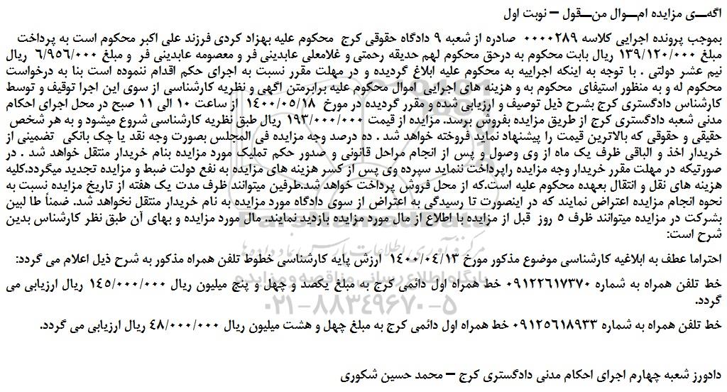 بموجب پرونده اجرایی کلاسه 0000289  صادره از شعبه 9 دادگاه حقوقی کرج  محکوم علیه بهزاد کردی فرزند علی اکبر محکوم است به پرداخت  مبلغ 139/120/000 ریال بابت محکوم به درحق محکوم لهم حدیقه رحمتی و غلامعلی عابدینی فر و معصومه عابدینی فر  و مبلغ 6/956/000  ریال نیم عشر دولتی . با توجه به اینکه اجراییه به محکوم علیه ابلاغ گردیده و در مهلت مقرر نسبت به اجرای حکم اقدام ننموده است بنا به درخواست محکوم له و به منظور استیفای  محکوم به و هزینه های اجرایی  اموال محکوم علیه برابرمتن اگهی و نظریه کارشناسی از سوی این اجرا توقیف و توسط کارشناس دادگستری کرج بشرح ذیل توصیف و ارزیابی شده و مقرر گردیده در مورخ  1400/05/18  از ساعت 10 الی 11 صبح در محل اجرای احکام مدنی شعبه دادگستری کرج از طریق مزایده بفروش برسد. مزایده از قیمت 193/000/000 ریال طبق نظریه کارشناسی شروع میشود و به هر شخص  حقیقی و حقوقی که بالاترین قیمت را پیشنهاد نماید فروخته خواهد شد . ده درصد وجه مزایده فی المجلس بصورت وجه نقد یا چک بانکی  تضمینی از خریدار اخذ و الباقی ظرف یک ماه از وی وصول و پس از انجام مراحل قانونی و صدور حکم تملیک مورد مزایده بنام خریدار منتقل خواهد شد . در صورتیکه در مهلت مقرر خریدار وجه مزایده راپرداخت ننماید سپرده وی پس از کسر هزینه های مزایده به نفع دولت ضبط و مزایده تجدید میگردد.کلیه هزینه های نقل و انتقال بعهده محکوم علیه است.که از محل فروش پرداخت خواهد شد.طرفین میتوانند ظرف مدت یک هفته از تاریخ مزایده نسبت به نحوه انجام مزایده اعتراض نمایند که در اینصورت تا رسیدگی به اعتراض از سوی دادگاه مورد مزایده به نام خریدار منتقل نخواهد شد. ضمناً طا لبین بشرکت در مزایده میتوانند ظرف 5 روز  قبل از مزایده با اطلاع از مال مورد مزایده بازدید نمایند. مال مورد مزایده و بهای آن طبق نظر کارشناس بدین شرح است: