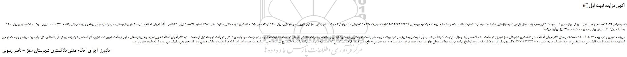 اجرای احکام مدنی دادگستری شهرستان سقز در نظر دارد در رابطه با پرونده اجرائی بکلاسه 0000339  ارزیابی  یک دستگاه سواری پراید 141dlxi به شماره پلاک47 م818 ایران 61در پارکینگ حکمت شهرستان سقز نوع کاربری  سیستم وتیپ پراید 141 دوگانه سوز  رنگ خاکستری  نوک مدادی متالیک مدل 1386 شماره 47م818 ایران 61 شاسی s1482286212697 شماره موتور 1894143 -جلو عقب ضرب دیدگی وباز سازی شده -جفت گلگیر عقب وکف محل زاپاس ضربه وبازسازی شده است -وضعیت لاستیک مناسب 85در صد سالم  بیمه نامه وتخفیف بیمه ای ومدارک روئیت نشد ارزش ریالی خودرو 450/000/000 ریال برآورد میگردد.