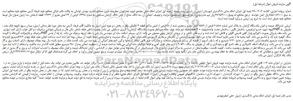 شماره پرونده اجرایی: کلاسه 9901206 شعبه اول اجرای احکام مدنی دادگستری شهرستان اردبیل در راستای نیابت واصله ازشعبه اول اجرای احکام مدنی مجتمع شهید باهنرتهران مطروحه مابین، محکوم له:سید مهدی لواسانی به وکالت خانم خزائی محکوم علیه :فرهاد آذرمی محکوم علیه محکوم است به مبلغ755/083/000ریال اصل خواسته درحق محکوم له ومبلغ37/754/000ریال نیم عشردولتی درحق صندوق دولت،مورد مزایده و توصیف اجمالی آن: سه دانگ مشاع از شش دانگ آپارتمان مسکونی به شماره 16425 فرعی از 33 اصلی مفروز از 14723 قطعه 5 بخش سه اردبیل بعنوان مال توسط محکوم علیه معرفی شده است. به شرح زیر ارزیابی و برآورد قیمت شده است؛