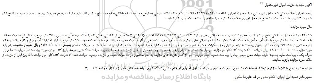 ششدانگ یکباب منزل مسکونی واقع در شهرک ولیعصر پشت مدرسه صدف تاش روبروی کوثر 4 کد پستی 5517963317 تحت پلاک ثبتی 507 فرعی از 2 اصلی بخش 3 مراغه که عرصه آن به میزان 750 متر مربع و اعیانی ان بصورت همکف با مساحت حدودا 80 متر مربع با سازه آجر و آهن با قدمت ساخت بالای 20 ساله و اعیانی های دیگری با سازه آجر و چوب که برخی از آنها بصورت مخروبه میباشد جمعا مساحت حدود 150 متر مربع و دارای امتیازات آب و برق و گاز میباشد و خانم زکیه خاتمی در ششدانگ پلاک مذکور بدون پرداخت هزینه ای دارای حق سکونت به شرط عمری دارد و خریدار تا عمر مشارالیه حق تصرف در ملک را ندارد ارزش 750 متر مربع پلاک مذکور بمبلغ 11/200/000/000 ریال تعیین مشود.مبلغ پایه مورد مزایده 11/200/000/000 ریال میباشد.  2) شرکت کنندگان در مزایده می بایست ده درصد مبلغ پایه را به صورت چک تضمینی یا قبل از مزایده به حساب سپرده موقت دادگستری مراغه واریز کنند و در صورت برنده شدن میبایست مابقی را ظرف یکماه پرداخت نمایدچنانچه ظرف مهلت مقرر مابقی بهاء را پرداخت ننماید مبلغ تودیعی پس از کسر هزینه های مزایده به نفع صندوق درآمد دولت ضبط و مزایده تجدید خواهد شد. 3) شرکت کنندگان می توانند تا 5 روز قبل از مزایده از ملک مورد مزایده بازدید نمایند.