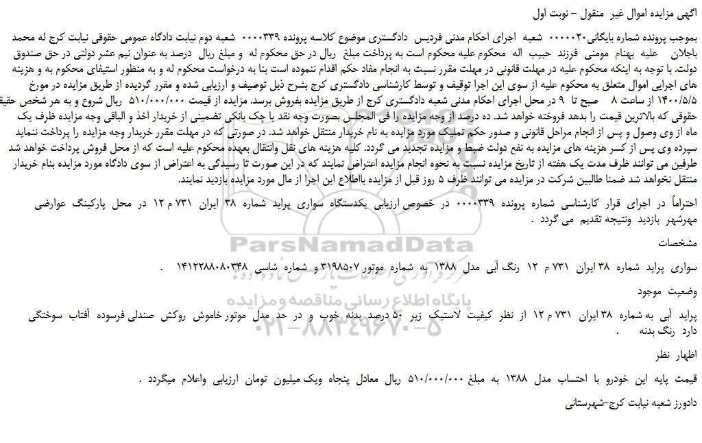 بموجب پرونده شماره بایگانی0000020  شعبه  اجرای احکام مدنی فردیس  دادگستری موضوع کلاسه پرونده 0000339  شعبه دوم نیابت دادگاه عمومی حقوقی نیابت کرج له محمد  باجلان    علیه  بهنام  مومنی  فرزند  حبیب  اله  محکوم علیه محکوم است به پرداخت مبلغ  ریال در حق محکوم له  و مبلغ ریال  درصد به عنوان نیم عشر دولتی در حق صندوق دولت. با توجه به اینکه محکوم علیه در مهلت قانونی در مهلت مقرر نسبت به انجام مفاد حکم اقدام ننموده است بنا به درخواست محکوم له و به منظور استیفای محکوم به و هزینه های اجرایی اموال متعلق به محکوم علیه از سوی این اجرا توقیف و توسط کارشناسی دادگستری کرج بشرح ذیل توصیف و ارزیابی شده و مقرر گردیده از طریق مزایده در مورخ      1400/5/5 از ساعت 8    صبح تا  9 در محل اجرای احکام مدنی شعبه دادگستری کرج از طریق مزایده بفروش برسد. مزایده از قیمت 510/000/000  ریال شروع و به هر شخص حقیقی و حقوقی که بالاترین قیمت را بدهد فروخته خواهد شد. ده درصد از وجه مزایده را فی المجلس بصورت وجه نقد یا چک بانکی تضمینی از خریدار اخذ و الباقی وجه مزایده ظرف یک ماه از وی وصول و پس از انجام مراحل قانونی و صدور حکم تملیک مورد مزایده به نام خریدار منتقل خواهد شد. در صورتی که در مهلت مقرر خریدار وجه مزایده را پرداخت ننماید سپرده وی پس از کسر هزینه های مزایده به نفع دولت ضبط و مزایده تجدید می گردد. کلیه هزینه های نقل وانتقال بعهده محکوم علیه است که از محل فروش پرداخت خواهد شد طرفین می توانند ظرف مدت یک هفته از تاریخ مزایده نسبت به نحوه انجام مزایده اعتراض نمایند که در این صورت تا رسیدگی به اعتراض از سوی دادگاه مورد مزایده بنام خریدار منتقل نخواهد شد ضمنا طالبین شرکت در مزایده می توانند ظرف 5 روز قبل از مزایده بااطلاع این اجرا از مال مورد مزایده بازدید نمایند.