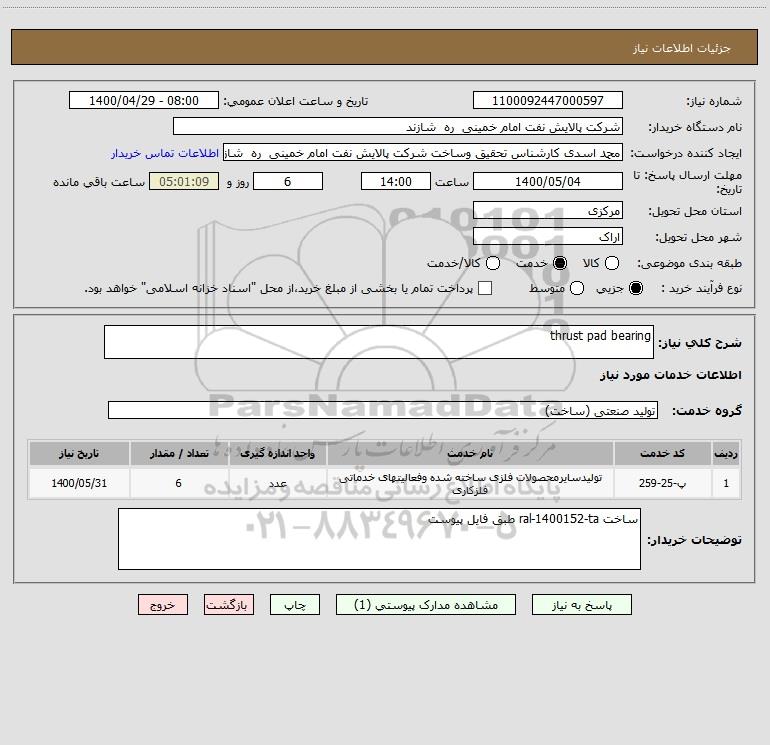 استعلام بها و موضوع استعلام استعلام thrust pad bearing به اطلاع کلیه شرکتها و افراد متخصص واجد شرایط میرساند، آگهی گذار در نظر دارد از طریق استعلام بها، نسبت به انتخاب و دریافت پیشنهادات اقدام نماید. این استعلام با کد آگهی ثبت شده در سامانه خبرگزاری پارس نماد : 3603734 منتشر شده است. مشخصات استعلام : تاریخ شروع استعلام: 1400/04/29 آخرین مهلت ارسال پیشنهاد قیمت : 1400/05/04 و محل اجرای پروژه : استان مرکزی میباشد. استعلام قیمت مورد درخواست : استعلام thrust pad bearing با دستهبندیهای تخصصی و گروه های مرتبط : انواع بلبرینگ و رولبرینگ, تجهیزات و ماشین آلات صنعتی, استعلام اطلاع رسانی میگردد.