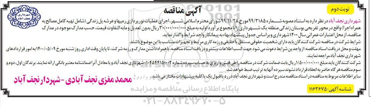 شهرداری نجف آباد به استناد مصوبه شماره 99/3185 مورخ 99.11.28 شورای محترم اسلامی،  اجرای عملیات نورپردازی رمپها و عرشه پل زندگی (شامل تهیه کامل مصالح به همراه اجرا) واقع در محور تفریحی بوستان زندگی منطقه یک شهرداری را با مجموع برآورد اولیه به مبلغ 30.000.000.000 ریال بدون تعدیل و مابه التفاوت قیمت حسب مدارک موجود در مناقصه از محل اعتبارات عمرانی سال 1400 شهرداری و براساس جدول پیشنهاد بها به پیمانکار واجد شرایط واگذار نماید