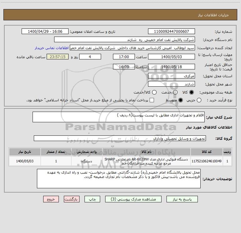 شرح کلی نیاز: اقلام و تجهیزات اداری مطابق با لیست پیوست(۸ ردیف )