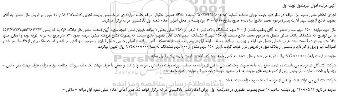 مزایده،مزایده فروش 150 سهم مشاع  از 600 سهم ششدانگ پلاک ثبتی 1 فرعی از 3562 اصلی