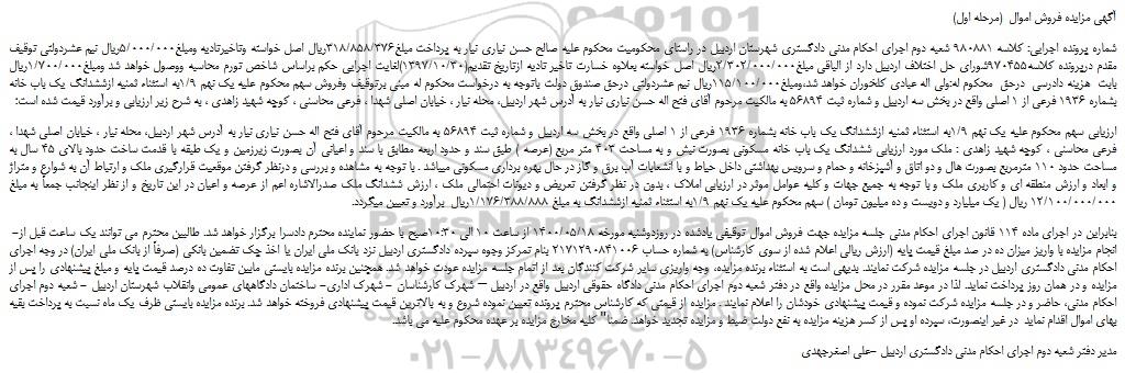 شماره پرونده اجرایی: کلاسه 980881 شعبه دوم اجرای احکام مدنی دادگستری شهرستان اردبیل در راستای محکومیت محکوم علیه صالح حسن نیاری نیار به پرداخت مبلغ318/858/376ریال اصل خواسته وتاخیرتادیه ومبلغ5/000/000ریال نیم عشردولتی توقیف مقدم درپرونده کلاسه970455شورای حل اختلاف اردبیل دارد از الباقی مبلغ2/302/000/000ریال اصل خواسته بعلاوه خسارت تاخیر تادیه ازتاریخ تقدیم(1397/10/30)لغایت اجرایی حکم براساس شاخص تورم محاسبه ووصول خواهد شد ومبلغ1/700/000ریال بابت هزینه دادرسی درحق محکوم له:ولی اله عبادی کلخوران خواهد شد،ومبلغ115/100/000ریال نیم عشردولتی درحق صندوق دولت باتوجه به درخواست محکوم له مبنی برتوقیف وفروش سهم محکوم علیه یک نهم 1/9به استثناء ثمنیه ازششدانگ یک باب خانه بشماره 1936 فرعی از 1 اصلی واقع در بخش سه اردبیل و شماره ثبت 56894 به مالکیت مرحوم آقای فتح اله حسن نیاری نیار به آدرس شهر اردبیل، محله نیار ، خیابان اصلی شهدا ، فرعی محاسنی ، کوچه شهید زاهدی ، به شرح زیر ارزیابی و برآورد قیمت شده است؛