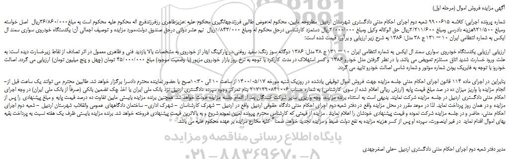 شماره پرونده اجرایی: کلاسه 9900615 شعبه دوم اجرای احکام مدنی دادگستری شهرستان اردبیل  مطروحه مابین، محکوم له:عوض طالبی فرزندجهانگیری محکوم علیه :عزیزطاهری رزفرزندفرج اله محکوم علیه محکوم است به مبلغ36/860/000ریال  اصل خواسته ومبلغ 921/500هزینه دادرسی ومبلغ 2/211/600ریال حق الوکاله وکیل ومبلغ 2/000/000ریال دستمزد کارشناسی درحق محکوم له ومبلغ 1/843/000ریال  نیم عشر دولتی درحق صندوق دولت،مورد مزایده و توصیف اجمالی آن: یکدستگاه خودروی سواری سمند ال ایکس به شماره انتظامی ایران 10 – 131 ج 38 مدل: 1386 به شرح زیر ارزیابی و برآورد قیمت شده است؛