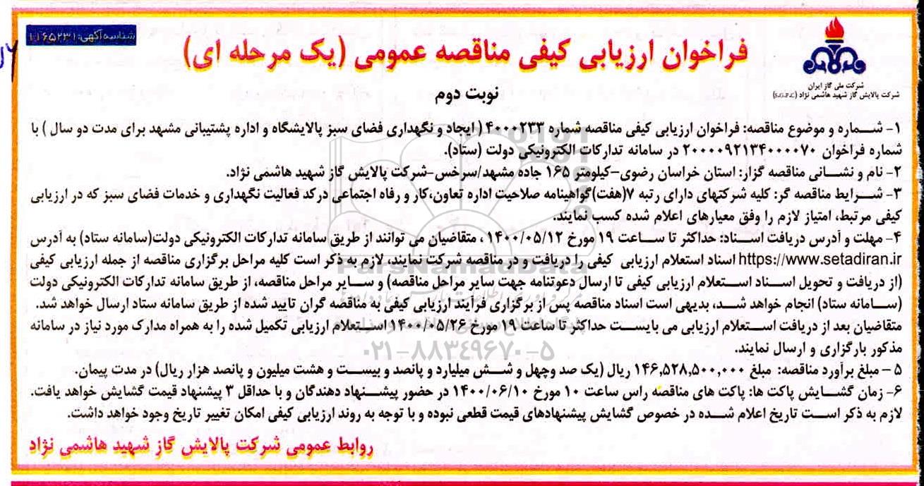 1- شماره و موضوع مناقصه: فراخوان ارزیابی کیفی مناقصه شماره 4000233 ( ایجاد و نگهداری فضای سبز پالایشگاه و اداره پشتیبانی مشهد برای مدت دو سال) با شماره فراخوان 2000092134000070 در سامانه تدارکات الکترونیکی دولت ستاد