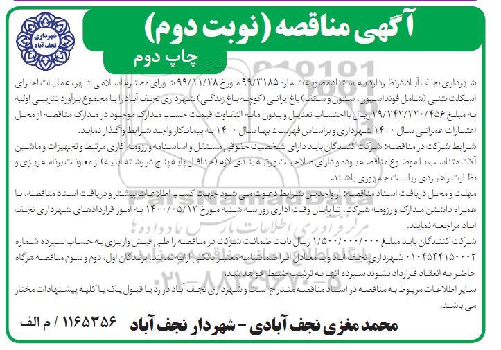 شهرداری نجف آباد به استناد مصوبه شماره 1400/3185 مورخ 99.11.28 شورای محترم اسلامی، عملیات اجرای اسکلت بتنی (شامل فونداسیون، ستون و سقف) باغ ایرانی (کوچه باغ زندگی) شهرداری نجف آباد را با مجموع برآورد تقریبی اولیه به مبلغ 29.242.220.456 ریال  با احتساب تعدیل و مابه التفاوت قیمت حسب مدارک موجود در مدارک مناقصه از محل اعتبارات عمرانی سال 1400 شهرداری و براساس فهرست بها سال 1400 به پیمانکار واجد شرایط واگذار نماید.