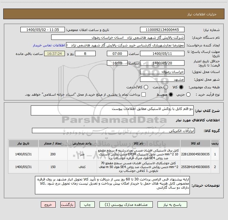 نام دستگاه خریدار:شرکت پالایش گاز شهید هاشمی نژاد استان خراسان رضوی