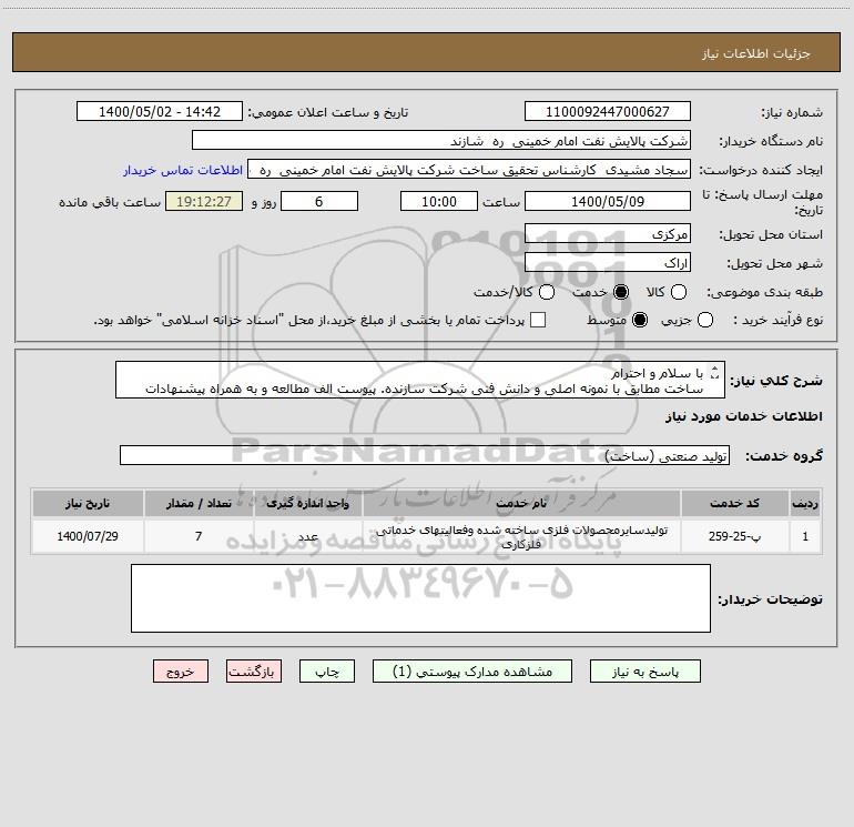 شرح کلی نیاز: با سلام و احترام ساخت مطابق با نمونه اصلی و دانش فنی شرکت سازنده. پیوست الف مطالعه و به همراه پیشنهادات مالی و فنی تایید و پیوست گردد