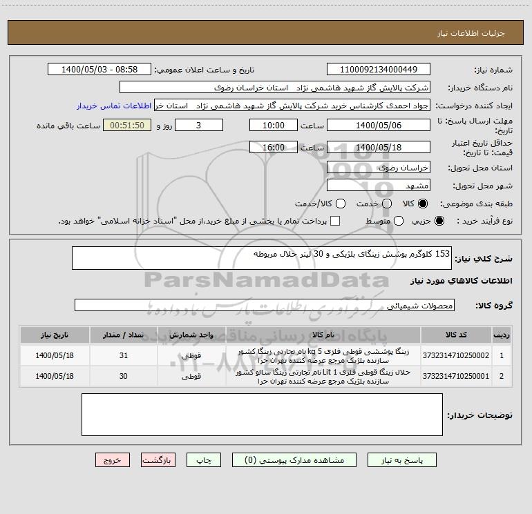 نام دستگاه خریدار:شرکت پالایش گاز شهید هاشمی نژاد استان خراسان رضوی