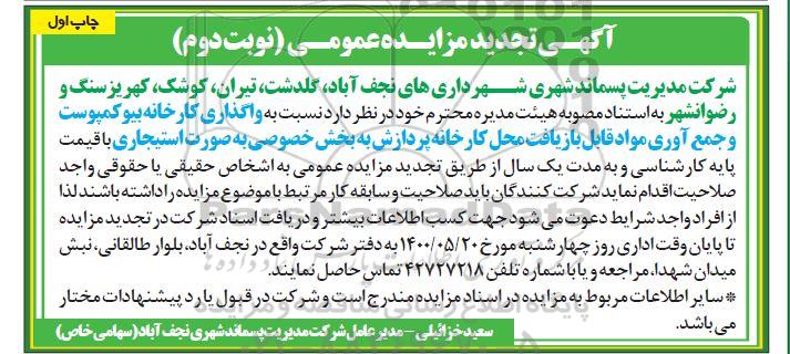 شرکت مدیریت پسماند شهری شهرداریهای نجف آباد، گلدشت، تیران، کوشک، کهریزسنگ و رضوانشهر به استناد مصوبه هیئت مدیره محترم خود در نظر دارد نسبت به واگذاری کارخانه بیوکمپوست و جمع آوری مواد قابل بازیافت محل کارخانه پردازش بخش خصوصی به صورت استیجاری با قیمت پایه کارشناسی و به مدت یک سال از طریق مزایده عمومی به اشخاص حقیقی و حقوقی واجد صلاحیت اقدام نماید. شرکت کنندگان باید صلاحیت و سابقه کار مرتبط با موضوع مزایده را داشته باشند لذا از افراد واجد شرایط دعوت می شود جهت کسب اطلاعات بیشتر و دریافت اسناد شرکت در مزایده تا پایان وقت اداری روز چهارشنبه مورخ 1400.5.20 به دفتر شرکت واقع در نجف آباد، بلوار طالقانی، نبش میدان شهد مراجعه و یا با شماره تلفن 42727218-031 تماس حاصل نمایند