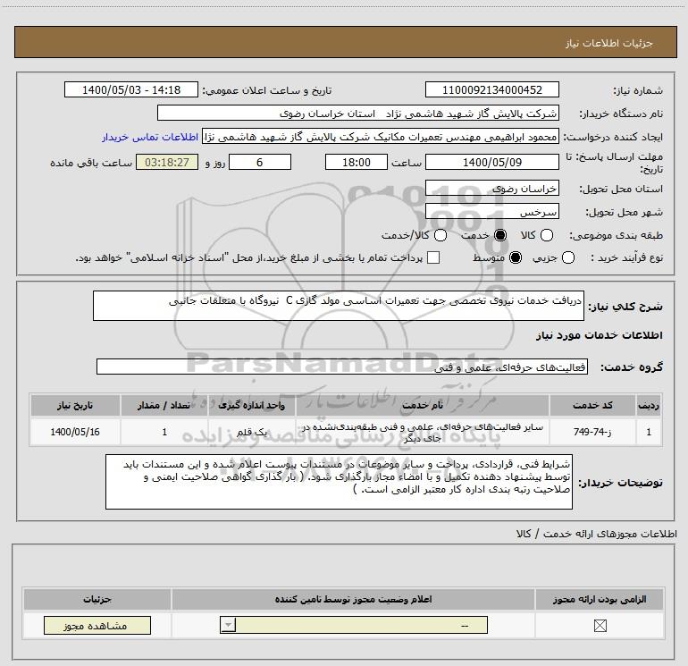 نام دستگاه خریدار:شرکت پالایش گاز شهید هاشمی نژاد استان خراسان رضوی