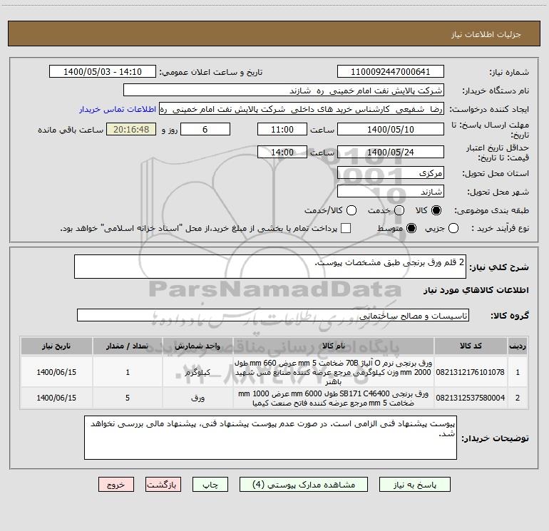 شرح کلی نیاز: 2 قلم ورق برنجی طبق مشخصات پیوست.