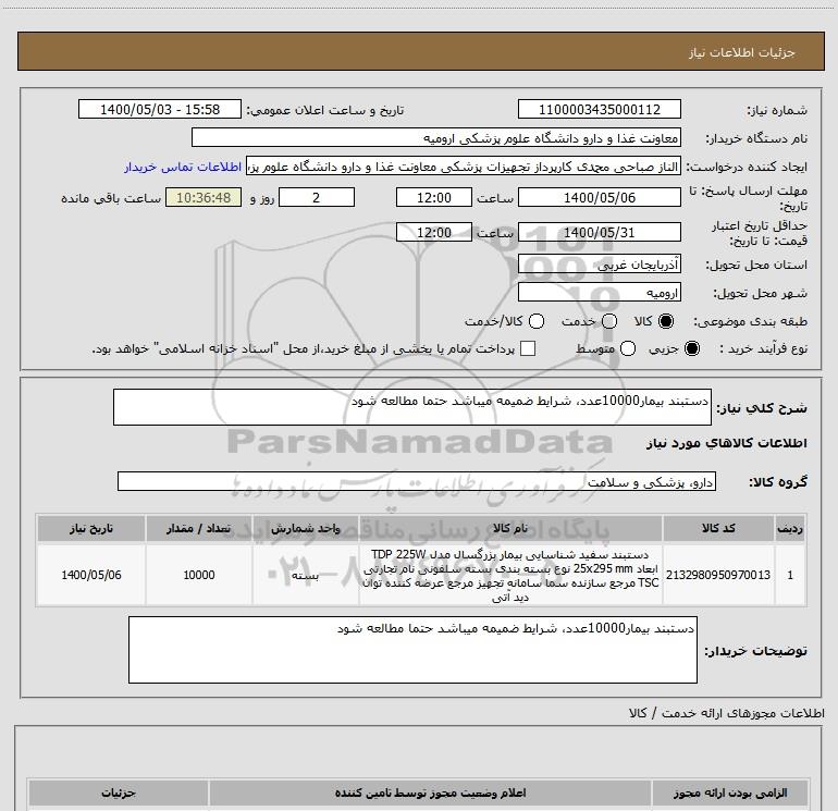 شرح کلی نیاز: دستبند بیمار10000عدد، شرایط ضمیمه میباشد حتما مطالعه شود