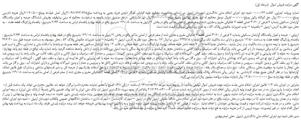 شماره پرونده اجرایی: کلاسه 0000023 شعبه دوم اجرای احکام مدنی دادگستری شهرستان اردبیل در راستای محکومیت محکوم علیه کیارش آهنگر داودی فرزند یحیی به پرداخت مبلغ3/048/792/795ریال اصل خواسته ومبلغ9/170/500ریال هزینه دادرسی ومبلغ12/000/000ریال حق الوکاله وکیل ومبلغ5/000/000ریال دوحق محکوم له امید وفرید ایواللهی وغیره ومبلغ21/000/000ریال نیم عشردولتی درحق صندوق دولت باتوجه به درخواست محکوم له مبنی برتوقیف وفروش ششدانگ عرصه و اعیان یکدستگاه آپارتمان مسکونی بشماره 7 فرعی از 4170 اصلی قطعه 7 تفکیکی مفروز و مجزی شده از صفر فرعی از اصلی مذکور واقع در بخش 2 اردبیل به مساحت 129/08 مترمربع واقع در طبقه چهارم بانضمام تراس به مساحت 2/66 مترمربع ، بانضمام پارکینگ قطعه هفت ، به محل مورد نظر به آدرس: اردبیل – باغمیشه – جنب تعزیرات حکومتی پلاک 53 ،، به شرح زیر ارزیابی و برآورد قیمت شده است؛