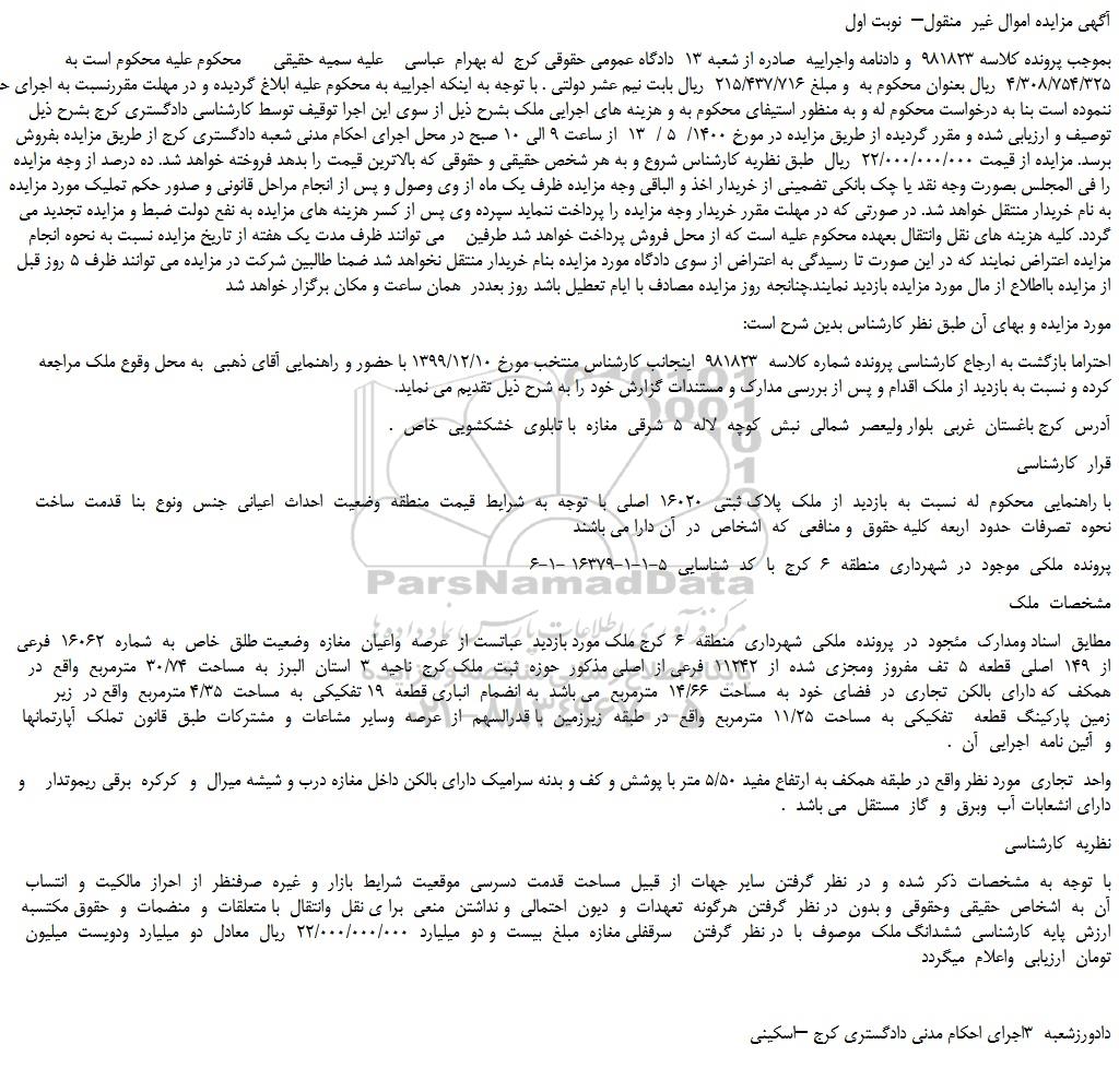 بموجب پرونده کلاسه 981823 و دادنامه واجراییه صادره از شعبه 13 دادگاه عمومی حقوقی کرج له بهرام عباسی علیه سمیه حقیقی محکوم علیه محکوم است به 4/308/754/325 ریال بعنوان محکوم به و مبلغ 215/437/716 ریال بابت نیم عشر دولتی . با توجه به اینکه اجراییه به محکوم علیه ابلاغ گردیده و در مهلت مقررنسبت به اجرای حکم اقدام ننموده است بنا به درخواست محکوم له و به منظور استیفای محکوم به و هزینه های اجرایی ملک بشرح ذیل از سوی این اجرا توقیف توسط کارشناسی دادگستری کرج بشرح ذیل توصیف و ارزیابی شده و مقرر گردیده از طریق مزایده در مورخ 1400/ 5 / 13 از ساعت 9 الی 10 صبح در محل اجرای احکام مدنی شعبه دادگستری کرج از طریق مزایده بفروش برسد. مزایده از قیمت 22/000/000/000 ریال طبق نظریه کارشناس شروع و به هر شخص حقیقی و حقوقی که بالاترین قیمت را بدهد فروخته خواهد شد. ده درصد از وجه مزایده را فی المجلس بصورت وجه نقد یا چک بانکی تضمینی از خریدار اخذ و الباقی وجه مزایده ظرف یک ماه از وی وصول و پس از انجام مراحل قانونی و صدور حکم تملیک مورد مزایده به نام خریدار منتقل خواهد شد. در صورتی که در مهلت مقرر خریدار وجه مزایده را پرداخت ننماید سپرده وی پس از کسر هزینه های مزایده به نفع دولت ضبط و مزایده تجدید می گردد. کلیه هزینه های نقل وانتقال بعهده محکوم علیه است که از محل فروش پرداخت خواهد شد طرفین می توانند ظرف مدت یک هفته از تاریخ مزایده نسبت به نحوه انجام مزایده اعتراض نمایند که در این صورت تا رسیدگی به اعتراض از سوی دادگاه مورد مزایده بنام خریدار منتقل نخواهد شد ضمنا طالبین شرکت در مزایده می توانند ظرف 5 روز قبل از مزایده بااطلاع از مال مورد مزایده بازدید نمایند.چنانجه روز مزایده مصادف با ایام تعطیل باشد روز بعددر همان ساعت و مکان برگزار خواهد شد