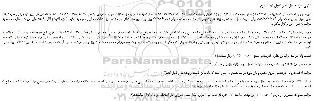 دایره اجرای احکام مدنی دو شورا حل اختلاف شهرستان مراغه در نظر دارد در جهت اجرای دادنامه شماره 9909976520500123صادره از شعبه 5 شورای حل اختلاف و پرونده اجرایی بشماره کلاسه 9900685و981147 ج/2له امیرعلی پور کرمجوان و علیه فرهاد نوایی مبنی بر پرداخت مبلغ 559/931/124 ریال از بابت اصل خواسته و هزینه های دادرسی در حق محکوم له و مبلغ 27/996/557 ریال بابت نیم عشر دولتی در حق صندوق دولت ، حال با توجه به توقیف (سهم الارث) آقای فرهاد نوایی جهت مطالبه محکوم به مزایده به شرح ذیل برگزار میگردد.