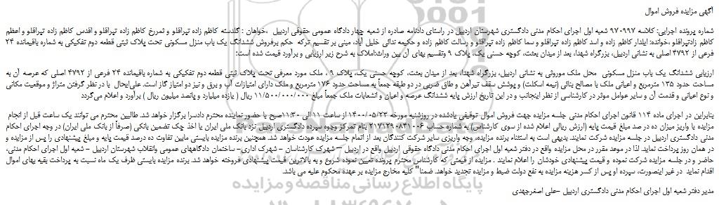 شماره پرونده اجرایی: کلاسه 970997 شعبه اول اجرای احکام مدنی دادگستری شهرستان اردبیل در راستای دادنامه صادره از شعبه چهار دادگاه عمومی حقوقی اردبیل ،خواهان : گلدسته کاظم زاده تپراقلو و ثمررخ کاظم زاده تپراقلو و اقدس کاظم زاده تپراقلو و اعظم کاظم زادتپراقلو ،خوانده: ایلدار کاظم زاده و اسد کاظم زاده تپراقلو و سما کاظم زاده تپراقلو و رسالت کاظم زاده و حکیمه ندائی خلیل آباد، مبنی بر تقسیم ترکه حکم برفروش ششدانگ یک باب منزل مسکونی تحت پلاک ثبتی قطعه دوم تفکیکی به شماره باقیمانده 24 فرعی از 4792 اصلی به نشانی اردبیل، بزرگراه شهدا، بعد از میدان بعثت، کوچه حسنی یک، پلاک 9 وتقسیم بهای آن بین وراث:املاک به شرح زیر ارزیابی و برآورد قیمت شده است؛