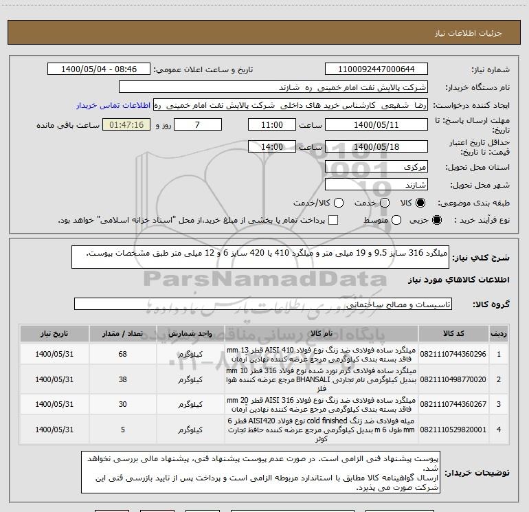 شرح کلی نیاز: میلگرد 316 سایز 9.5 و 19 میلی متر و میلگرد 410 یا 420 سایز 6 و 12 میلی متر طبق مشخصات پیوست.