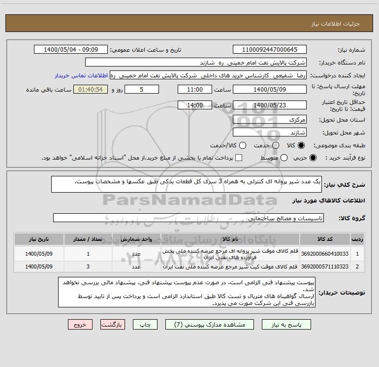 1 3692000660410033 قلم کالای موقت شیر پروانه ای مرجع عرضه کننده ملی پخش فرآورده های نفتی ایران عدد 1 1400/05/09